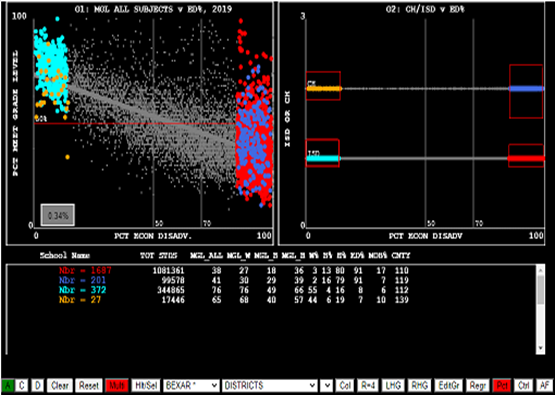 ISD schools versus percent economic disadvantage on the lower line, and