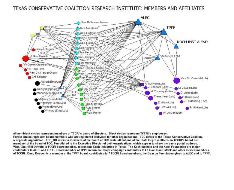 The main purpose of this paper is to demonstrate the numerous linkages and mutual support systems that exist among many of the most influential players in Texas governance within the confines of the TCCRI. Being a non-profit corporation, specifically a 501(c)(3), TCCRI is obliged to make available to the public very little of its internal operations and communications, and specifically is not required to make public its revenue sources. However, when one notices how many very significant state officials, members of the legislature and highly influential lobbyists are all on its board of directors, curiosity is unavoidable.