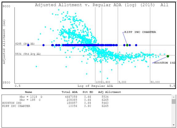 The following graph is used in several of the papers linked to on this web page. It is extremely helpful in understanding why charter schools, on average, receive greater amounts of maintenance and operations (M&O) dollars than do regular school districts. The graph shows the adjusted allotments (AAs) for all school district in color aqua. The arithmetic average of those AAs is $6,265 (for school year 2014-2015). This value is plotted for each charter school with color blue. As can be seen, $6,265 exceeds the AA for virtually all ISDs with regular ADAs exceeding 1,000. Only 4 percent of ISD ADA is included in the 400+ small districts that pull this average up. Approximately 70 percent of charter school students are in charter schools where their AAs exceed that for similar-sized ISDs. This is why, on average, charters receive more M&O dollars per pupil than do ISDs. The AA is perhaps the most crucial factor in Texas’ school funding formula.