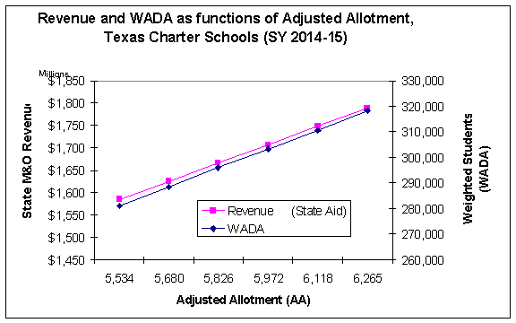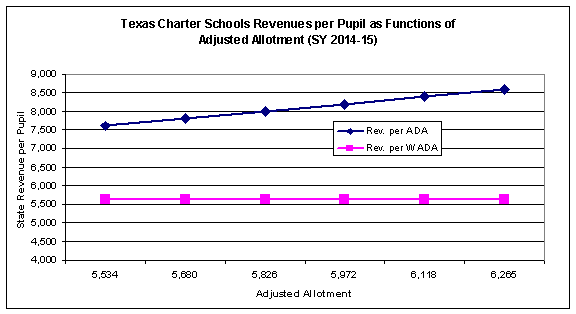 A series of calculations for the Charters were then carried out that varied only in the value used for the adjusted allotment. As can be seen in the following table six runs were made, with the AA going from 5,534 to 6,265. In other words, they began with the weighted average AA and ended up with the arithmetic average. For each AA the following table displays the amount of calculated state aid going to the Charters, and the calculated WADA. The Refined ADA, also called total ADA, did not change. For each level of AA the Revenue per ADA and Revenue per WADA were calculated. Also shown is the ratio of WADA/ADA. (The WADA/ADA ratio for all ISDs is 1.34)