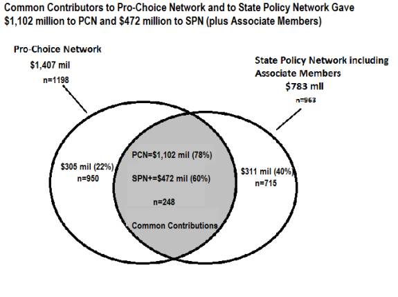 One of the goals here is to quantify the degree to which the two networks overlap, based on the pattern of foundation grants. Many analyses of the pro-choice movement have focused primarily on the institutions and sources of funding for the pro-choice education network itself, largely in isolation. The larger network, SPN+, which encompasses many issue areas beyond those relating strictly to education, is most often ignored or not explicitly included and taken into consideration when the focus is on educational issues. However, when one looks at the funding sources for the Pro-Choice Network and the State Policy Network, with the latter including the SPN’s associate members, it is